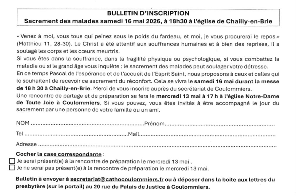 secretariat@cathocoulommiers.fr ou à déposer dans la boite aux lettres du presbytère (sur le portail) au 20 rue du